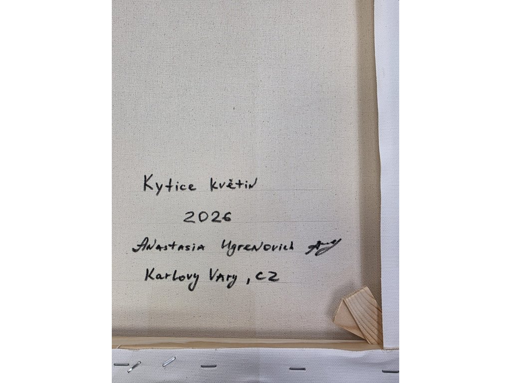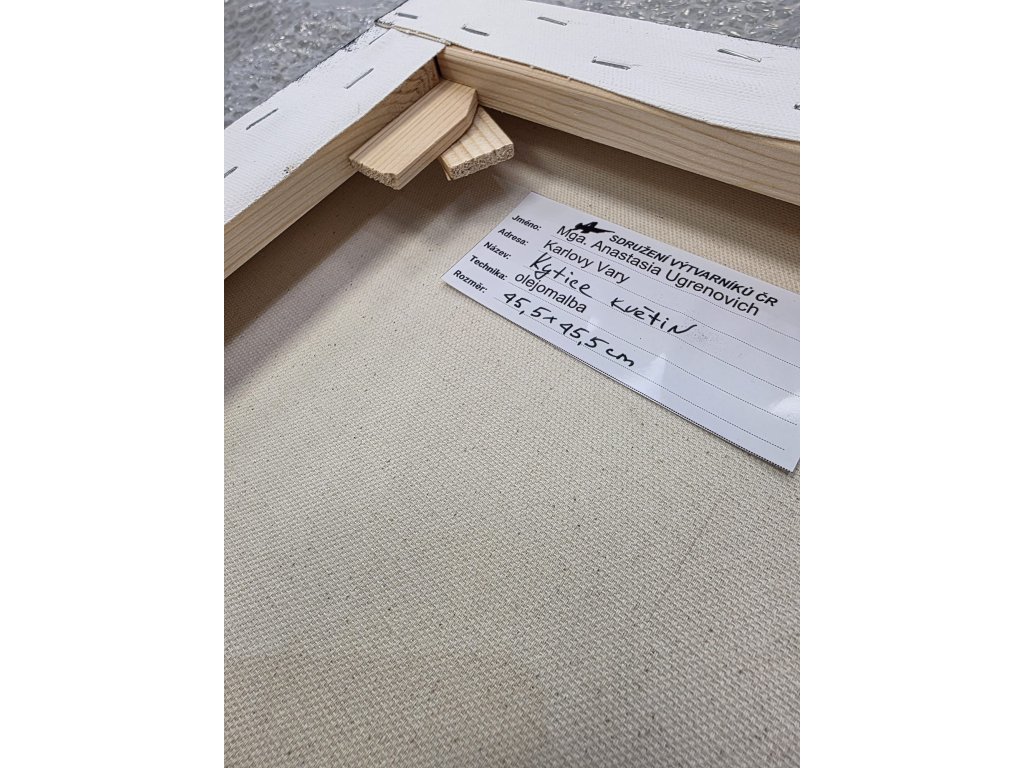 Plátno je napnuto na dřevěném blindrámu o hloubce 4 cm, vhodném i pro zavěšení bez nutnosti rámování.